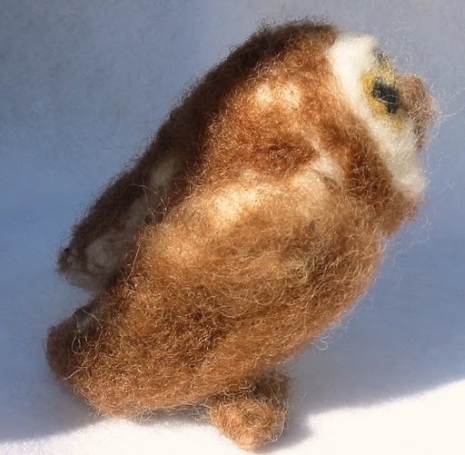 Barn owl has been felted over craft wire so his toes and legs are moveable and he stands on his own. He's about six inches tall. I used white corriedale wool and natural uncarded sheeps wool and merino wool roving for his detailing. The sheeps wool I washed myself.
